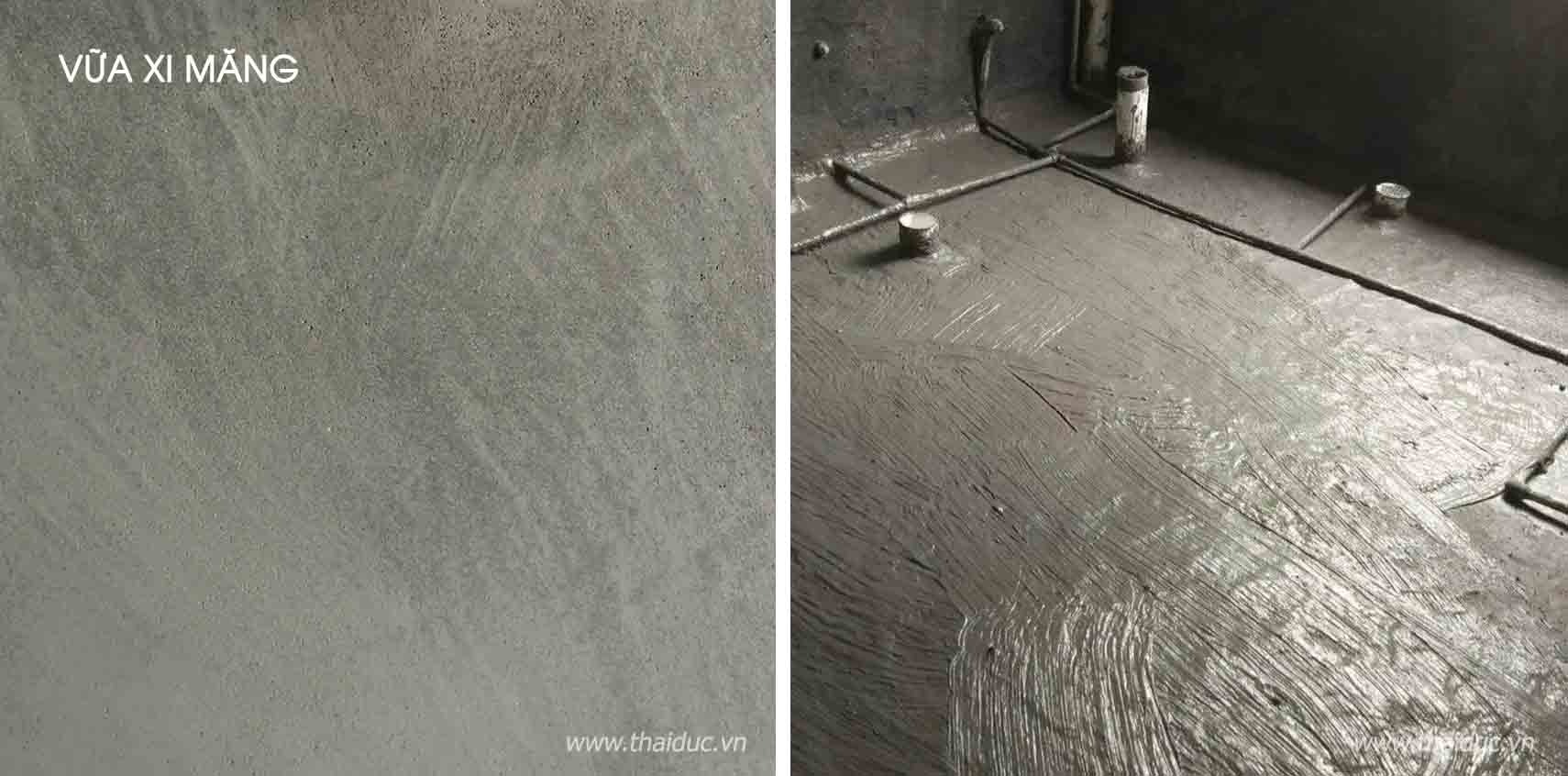 Vữa xi măng thích hợp cho các bộ phận có kết cấu tương đối ổn định, không độc hại, không gây hại và không gây ô nhiễm, có thể thi công trực tiếp lên bề mặt bê tông và có độ bám dính cao, sau hai giờ thi công có thể lát gạch trực tiếp lên trên . Nhược điểm là nó thiếu độ đàn hồi sau khi hình thành màng, điều này sẽ ảnh hưởng đến hiệu quả chống thấm do tòa nhà bị lệch hoặc lún.