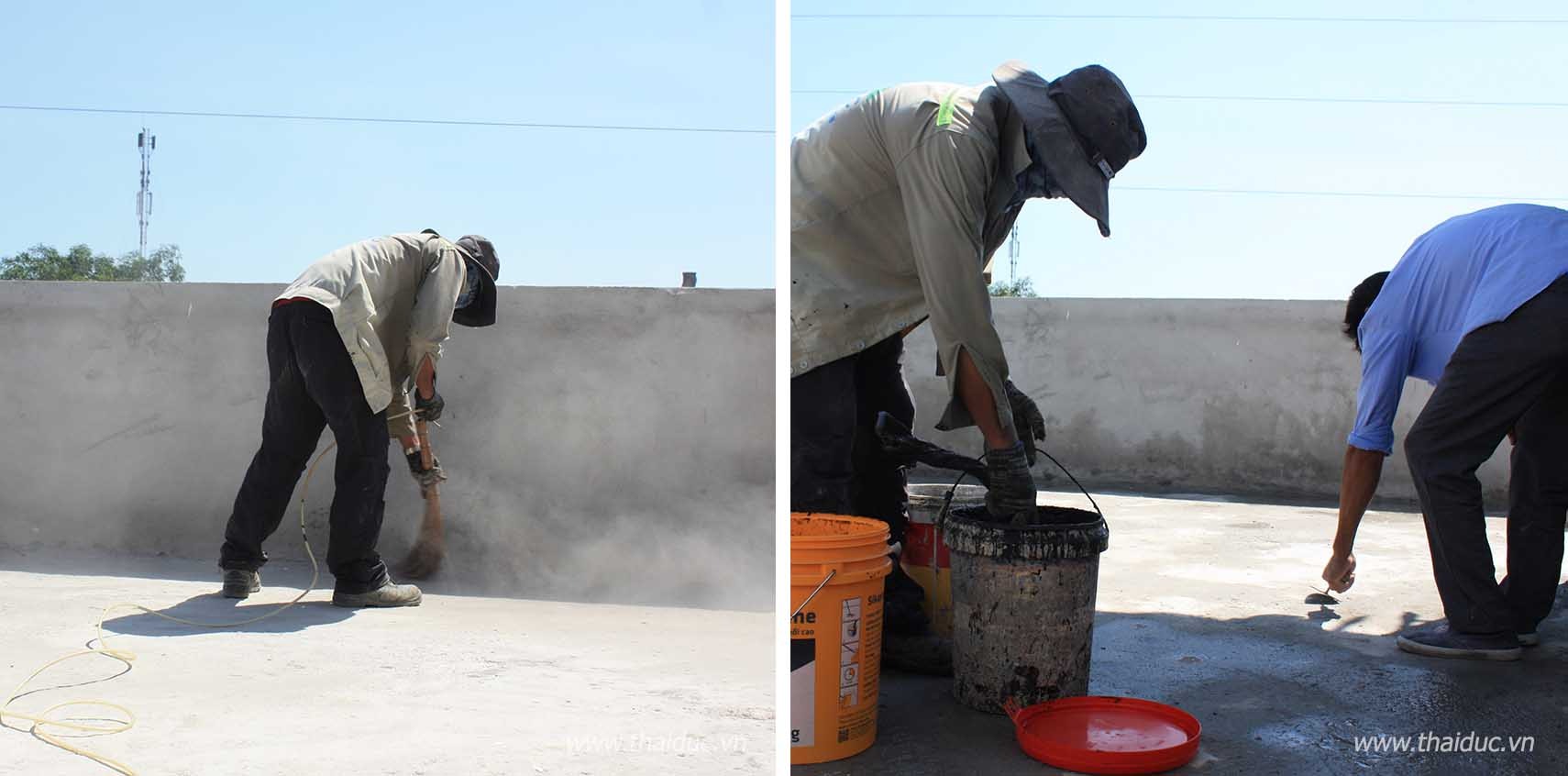 ‣ Ngoài ra còn phải được làm bằng phẳng loại bỏ các vị trí khuyết tật như hốc bọng, lỗ rỗ… phải tô trét vữa xi măng che phủ trước khi thi công xử lý chống nước. Đục bỏ phần bê tông không đặc chắc.