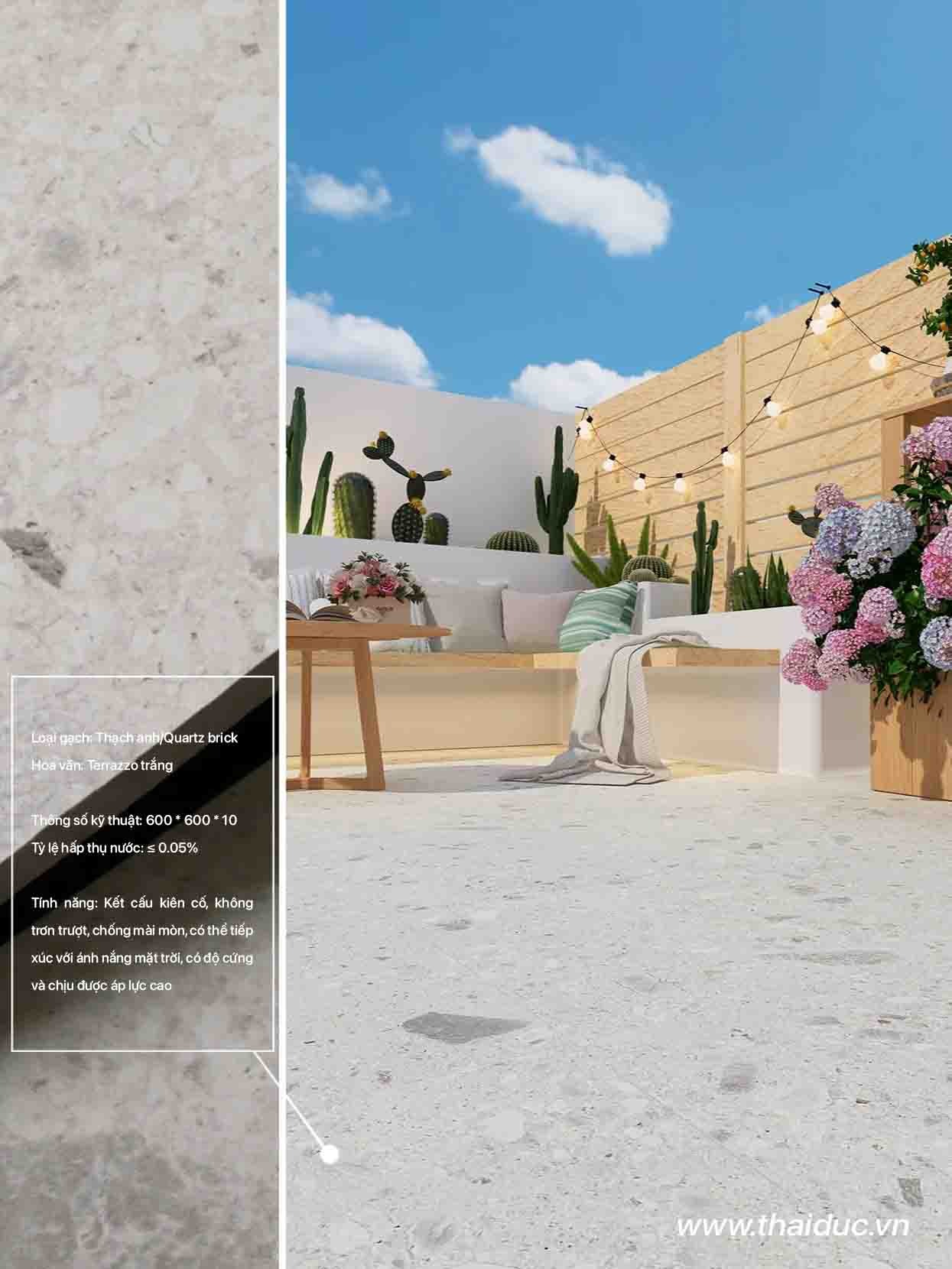 Tông màu trắng nhạt sáng và họa tiết tinh tế mang lại bầu không khí trong lành cho sân trong. Loại đá này phù hợp với nhiều phong cách trang trí sân khác nhau, giúp sân nhà bạn trông sáng sủa và rộng rãi hơn.