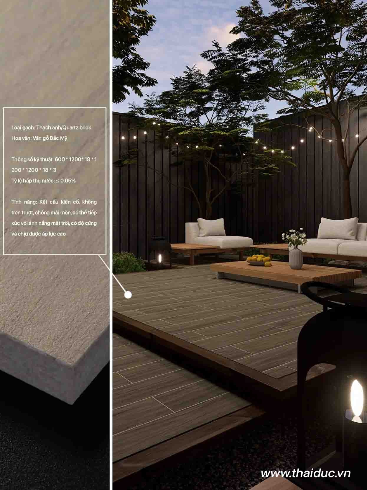 Gạch thạch anh vân gỗ Bắc Mỹ mang đến cảm giác ấm áp tự nhiên. Kết cấu của vân gỗ tạo thêm sự ấm áp cho sân trong, tạo cảm giác như bạn đang ở trong một khu rừng.
