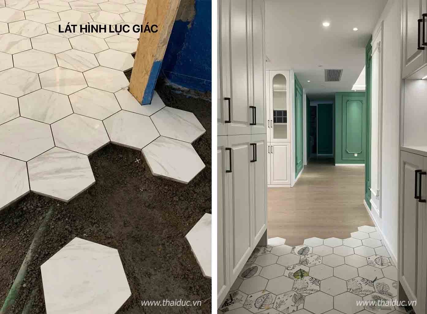 Gạch lục giác lát sàn có độ nhận diện cao và có thể làm cho ngôi nhà của bạn trở nên nổi bật. Đây là phương pháp lát nền phổ biến nhưng sẽ kiểm tra tay nghề của người thợ thi công. Có thể là gạch lục giác + sàn gỗ , hoặc cũng có thể được kết hợp với các loại gạch lớn khác.