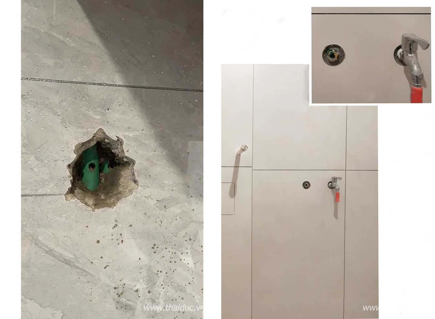 ‣ Gia công mở đường ống nước: Sau khi lát gạch sẽ đục lỗ nhưng các thợ thường dùng phương pháp thô, khiến cho các lỗ được tạo thành dạng cuộn, nên khi mở các lỗ phải trao đổi với chủ và dùng máy dụng cụ mở lỗ, anh hiểu rằng những lỗ được làm theo cách này rất gọn gàng và đẹp mắt.