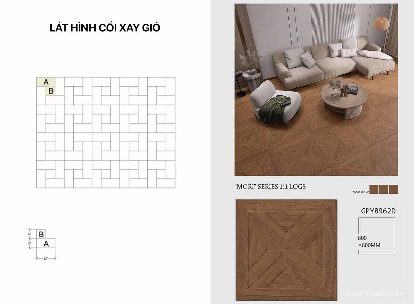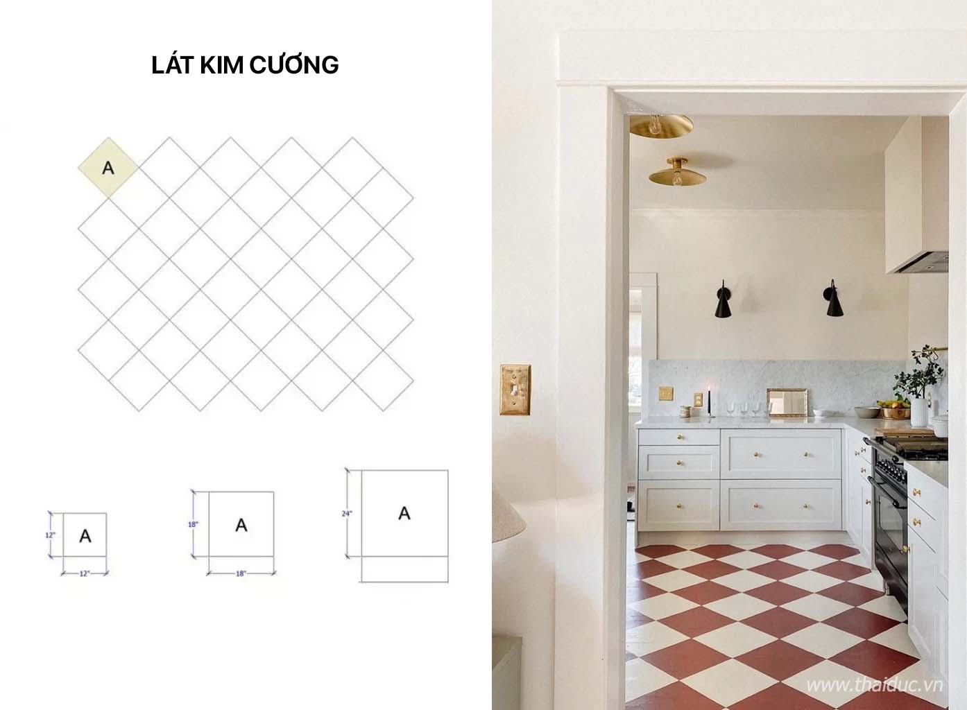 Hiệu ứng xoay 45° dựa trên cách đặt ban đầu, xin lưu ý rằng do cắt sau nên tổn thất sẽ lớn hơn một chút, nên mua thêm vài miếng gạch để dự phòng.