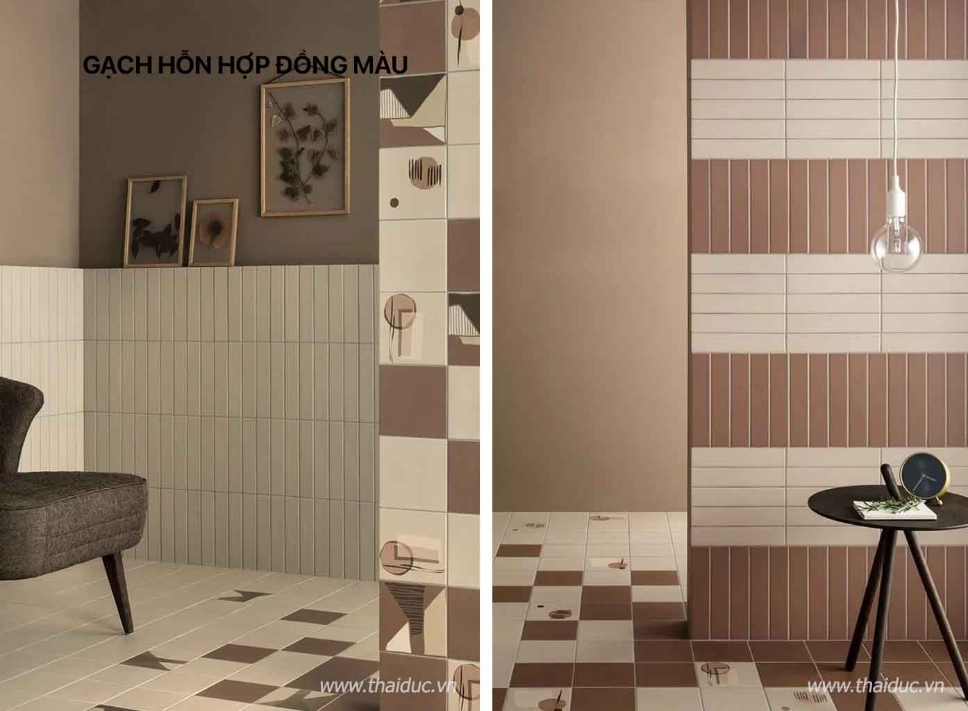 Có nhiều cách sắp xếp sự kết hợp giữa gạch men lớn và nhỏ, việc kết hợp lớn và nhỏ rất linh hoạt và ngăn nắp , làm nổi bật tính thời trang.