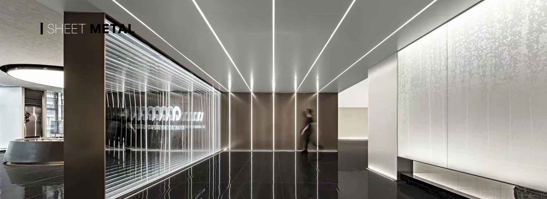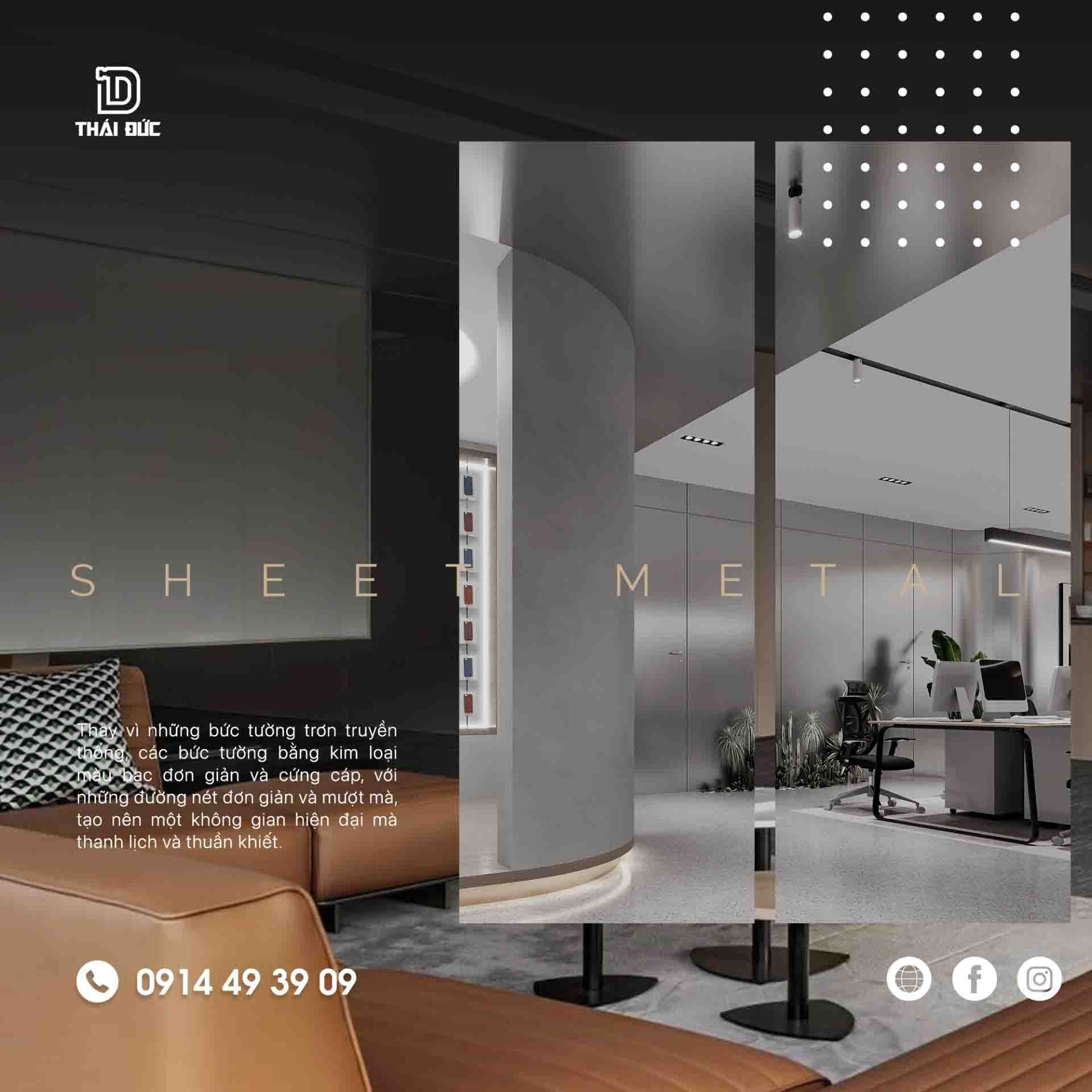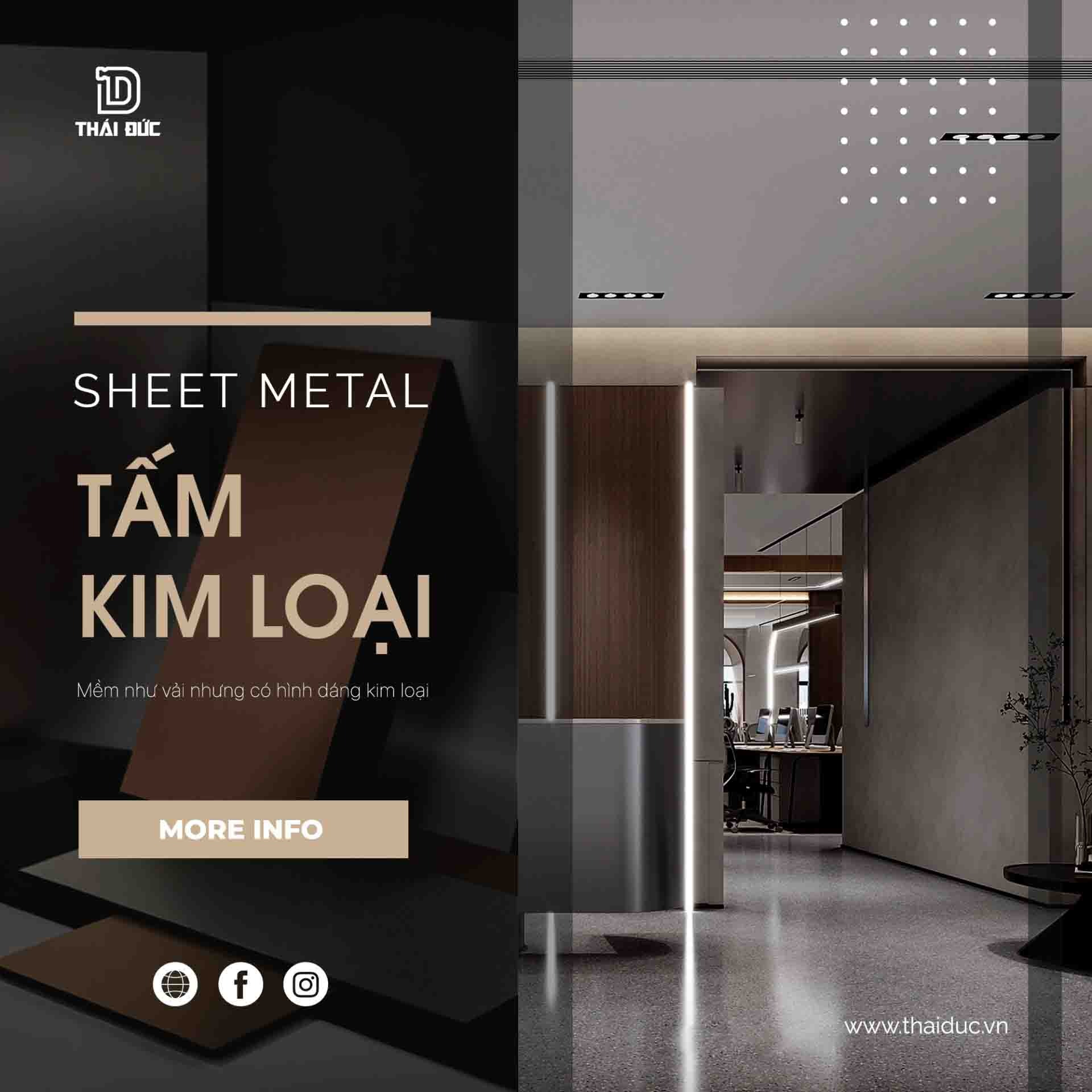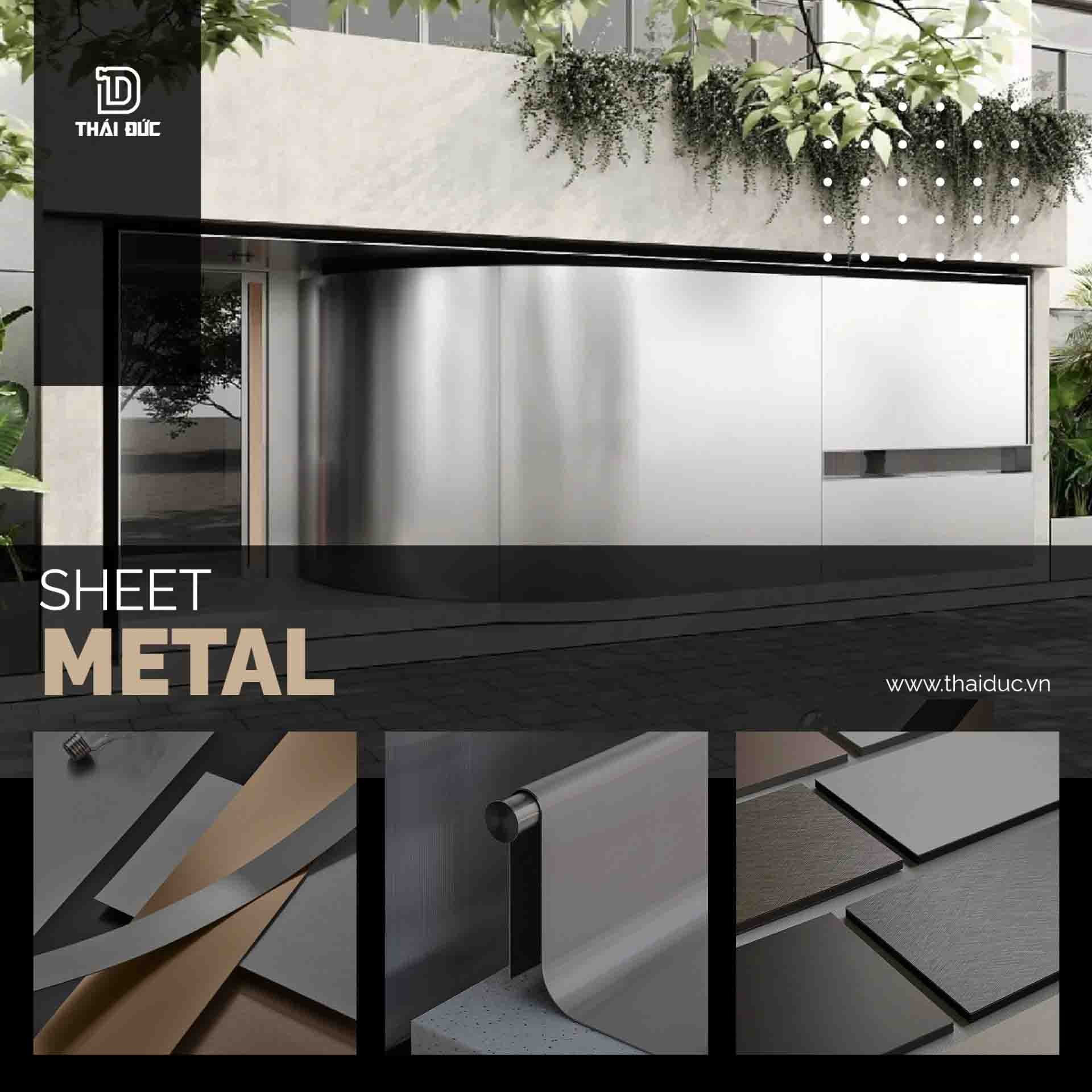 Nó không phải là kim loại mà có kết cấu kim loại, có thể uốn cong mà không bong tróc, phồng rộp hay biến dạng; không thấm nước, chống ẩm, thân thiện với môi trường phù hợp cho tất cả các không gian thương mại lớn. Sheet Metal - tấm kim loại được làm bằng vật liệu cơ bản như nhôm và hợp kim nhôm, thép, thép không gỉ… bề mặt được xử lý thông qua các quy trình khác nhau tạo thành.