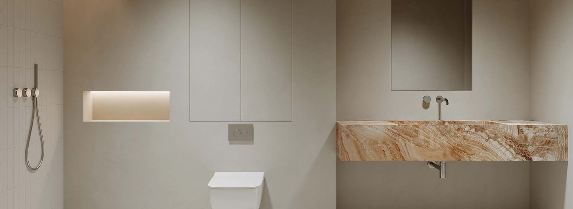 Phòng tắm trở nên rộng rãi hơn nếu ốp thạch cao, kết hợp với ánh sáng đem lại cảm giác ấm áp, thư thái