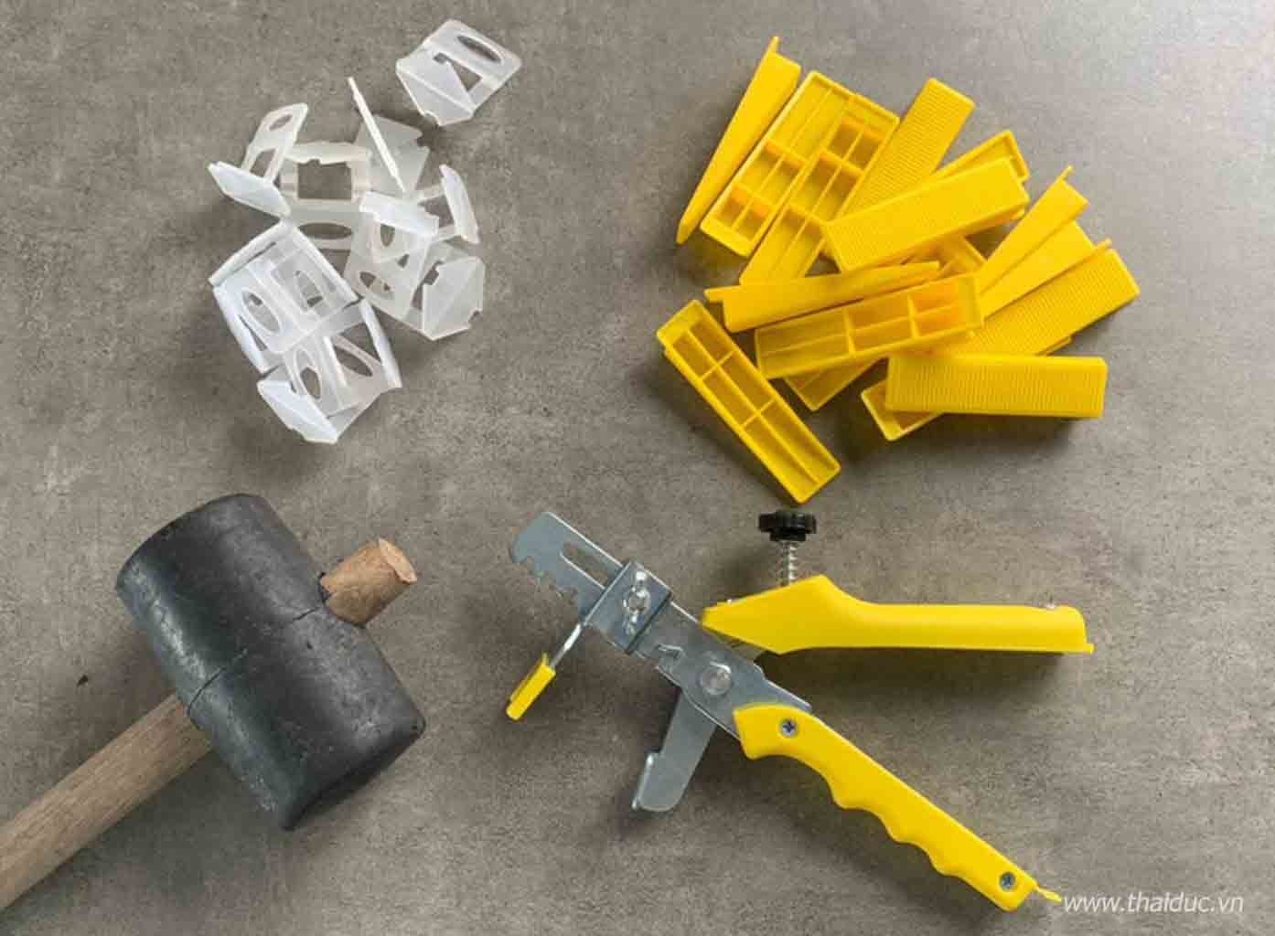‣ Ke cân bằng, búa cao su và bay răng cưa là những dụng cụ cần thiết cho quá trình thi công gạch ốp lát, góp phần tạo nên một bề mặt gạch ốp lát hoàn thiện bằng phẳng, các ron gạch thẳng và đều nhau.