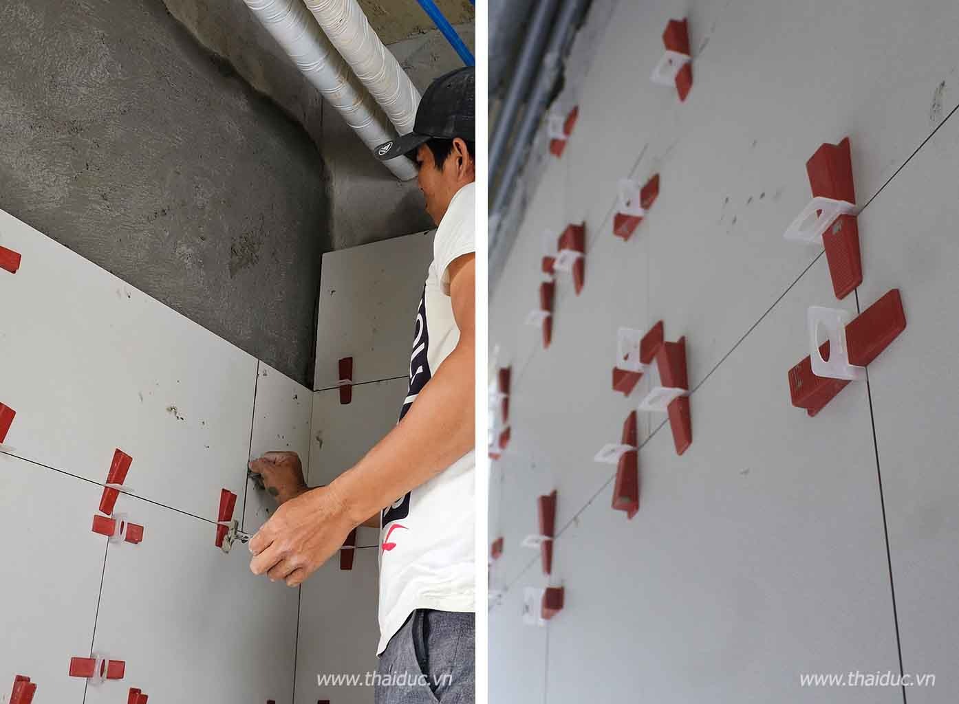 Gắn ke cân bằng ốp gạch vào vị trí giữa và 4 các góc của viên gạch. Căn chỉnh các góc bằng ke góc, dùng búa cao su gõ nhẹ lên bề mặt gạch để 2 lớp kéo dán bão hòa với nhau, tăng độ bám dính.